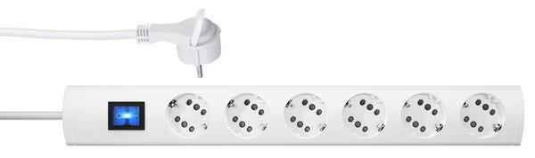 DUOversal Plus, 6=12, mit extraflachem Winkelstecker (8mm), je Steckdosentopf Anschlussmöglichkeit für einen Schutzkontakt- oder zwei Eurostecker, mit 2-poligem beleuchteten Schalter, mit erhöhtem Berührungsschutz, mit 35° gedrehten Töpfen, Topfabstand 52mm, Zuleitung H05VV-F3G1,5mm², 1,4m, anschraubbar, 16A, 250V~, Farbe: weiß