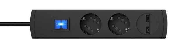 DUOversal Plus, 2=4, mit 2-fach USB-Ladeport 2100mA, je Steckdosentopf Anschlussmöglichkeit für einen Schutzkontakt- oder zwei Eurostecker, mit 2-poligem beleuchteten Schalter, mit erhöhtem Berührungsschutz, mit 35° gedrehten Töpfen, Topfabstand 52mm, Zuleitung H05VV-F3G1,5mm², 1,4m, anschraubbar, 16A, 250V~, Farbe: anthrazit