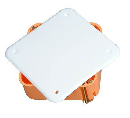 Hohlwand-Abzweigkasten mit Deckel, 105x105x45mm, IP30, Material Deckel: PS, Farbe Deckel: weiß, Material Dose: PP, Farbe Dose: orange, Umgebungstemperatur: -25°C bis 40°C, geignet für Rohreinführung 4x M16/M20 und 4x M20, 4x Leitungseinführung 3x1,5², Bemessungsspannung: 400 V, PVC-frei