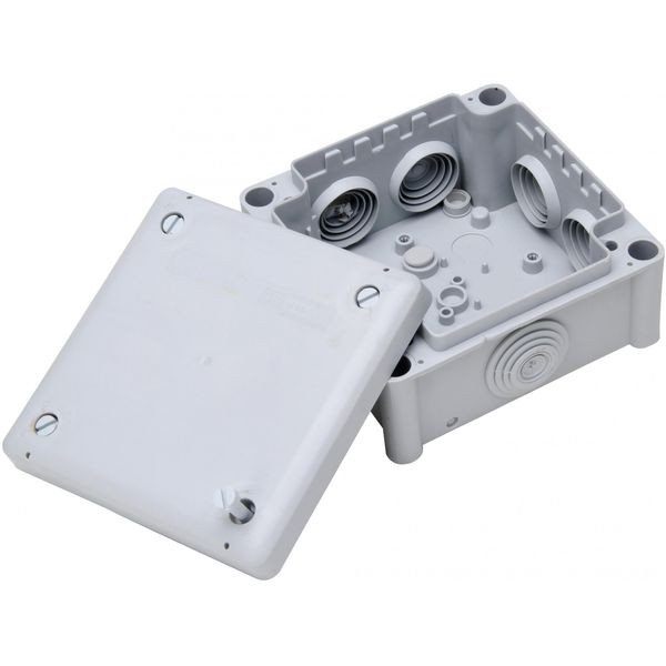 Feuchtraum Aufputz-Abzweigdose, 102x102x55mm, Isolierstoffklasse: ll, Einbauort: nicht brennbare Massivwände, Einsatztemperaturbereich: -5°C bis 60°C, Schutzklasse: IP66, Material: Thermoplast (PP), Selbstverlöschbarkeit: 750°C, Anzahl der Eingänge: 7xM25, Kabeldurchmesser: 3,5-25mm, Querschnittsfläche: 1,5-4mm², Farbe: grau