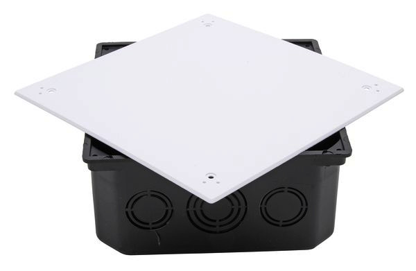 Abzweigkasten mit Randdeckel, 150x150mm, Farbe: schwarz, Farbe Deckel: weiß, IP30, max. 400V, 8x Eingang bis M25, 4x Eingang bis M32, zur Verlegung unter Putz, mit leicht ausbrechbaren