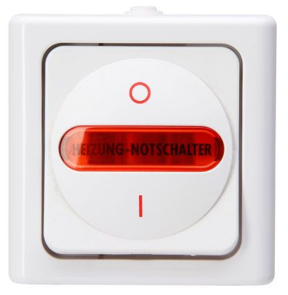 BLUE ELECTRIC - Aufputz Feuchtraum Heizungs-Hauptschalter (Aus, 2-polig) rotes Sichtfenster, Schrifteinlage "Heizungs-Notschalter" beleuchtet, 10AX, 250V~, IP44, Farbe: arktisweiß