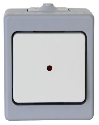 STANDARD - Aufputz Feuchtraum Kontrollschalter (Aus-/Wechselschalter), Linse mit Glimmlampe (beleuchtet), Bemessungsspannung 250V~, Schaltvermögen 10AX, Schutzart IP44, Farbe: grau