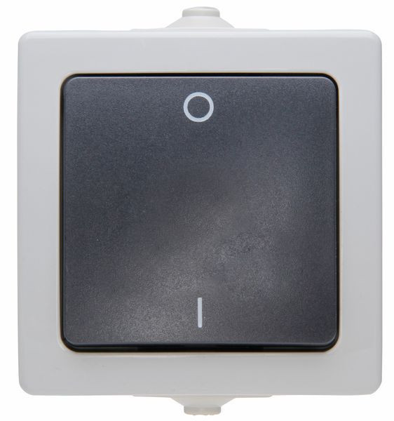 Aufputz-Feuchtraum 2-poliger Ausschalter im DesignNAUTIC und der Farbe grau mit einer Bemessungsspannung von 250V~ sowie einem Schaltvermögen von 10 AX. Schutzart IP44