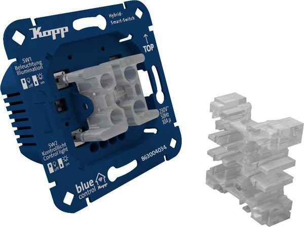 Blue-control Hybrid-Smart-Switch: Rollladen-, Jalousien-, Markiesensteuerung, 2-Kanal, 4-Draht, mit universeller Wippenaufnahme für alle gängigen Schaltersysteme, Bluetooth Mesh-Technologie, 230V~, 50Hz, 2x 1150W, 2,4GHz, Schutzart IP20, Farbe: blau
