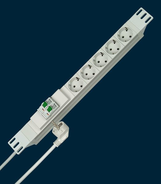 | Kurzbeschreibung | PROFIversal 5-fach, Steckdosenleiste in Schutzkontakt-Ausführung, mit Leitungsschutzschalter (B, 16A, 2-polig), 19", 2m Zuleitung, Farbe: aluminium |