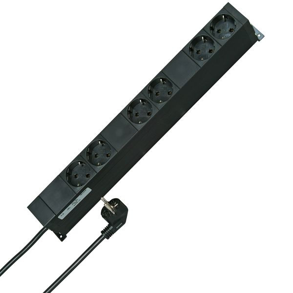PROFIversal PA, 6-fach, mit drei 2-poligem beleuchteten Schalter auf der Frontseite, 6 Steckplätze rückseitig, je 2 Steckplätze pro Schalter schaltbar, mit 45° gedrehten Töpfen, 44,45mm Topfabstand, universelle Befestigungsmöglichkeit, wiederanschließbar, Zuleitung H05VV-F3G 1,5mm², 2m, mit Schutzkontakt-Winkelstecker, 16A, 250V~, Länge 482,6mm, VDE, CEE7/III, Farbe: schwarz