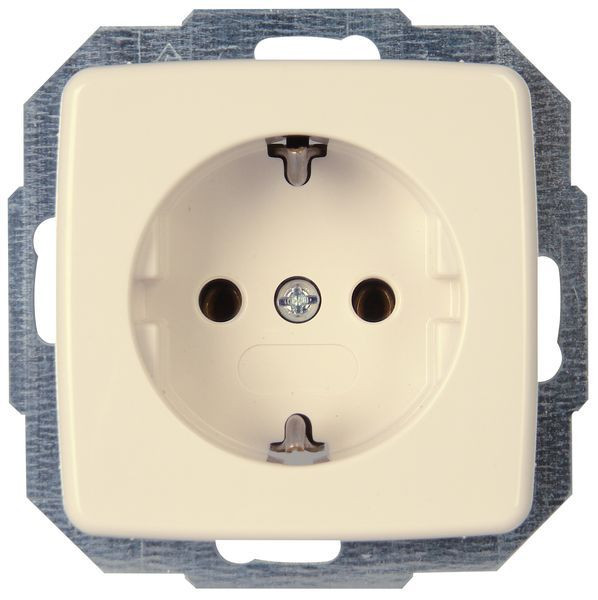 Schutzkontakt-Steckdose im Design RIVO und der Farbe cremeweiß. Der Nennstrom beträgt 16A und die Bemessungsspannung 250V~, Schutzart IP20