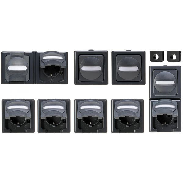 Testpaket BLUE ELECTRIC®, Farbe: anthrazit 2 x Aus-/Wechselschalter (Art. 560615007) 4 x Schutzkontakt-Steckdose für waagerechte Montage (Art. 103315007) 1 x 2-fach Schutzkontakt-Steckdose für waagerechte Montage (Art. 131215003) 1 x Aus-/Wechselschalter-Steckdosenkombination für senkrechte Montage (Art. 130815000) 2 x Verbindungsstück anthrazit (Art. 029405030)