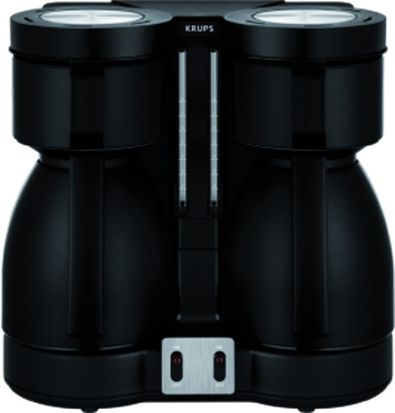 Aufsatzfilter, doppelwandige Isolierkannen mit Vakuum-Glaskolben und Tropfschutzring, 2 Wasserstandsanzeigen mit Lupeneffekt, 2 beleuchtete Ein-/Ausschalter, automatische Abschaltung, 2 x 850 W