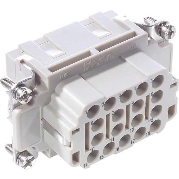 Crimpeinsatz Crimpeinsatz Buchse; Anzahl der Kontakte: 18+PE; Baugröße: 10B; 500 V AC rms / DC nach IEC; 16 A nach UL/CSA; Für Querschnitt (min./max.): 4mm² - 4mm²; Polycarbonat