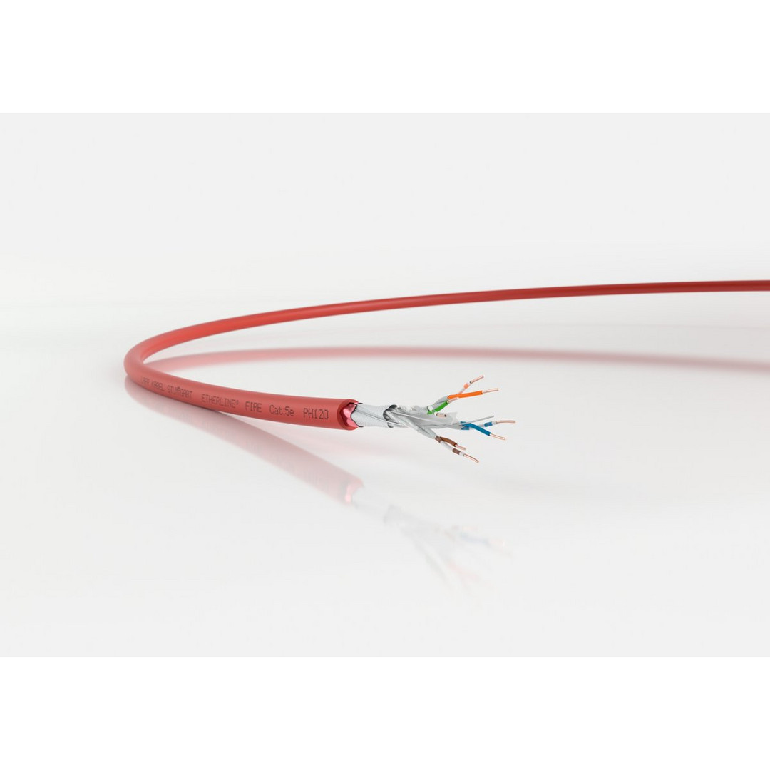 Ethernet-Leitung ETHERLINE® FIRE Cat.5e PH120 4x2x23/1 AWG 100 M; Ethernet-Leitung; feste Verlegung; ETHERNET/IP; Cat.5e; F/FTP; Halogenfrei; rot; Anwendungsgebiete: Variante „Cat 6“ speziell zur Daten- und Signalübertragung in Bereichen, die im Brandfall wesentlich für die laufende Funktionsfähigkeit einer Anlage sind (Notstromkreise);Zur Verwendung in der Gebäudeautomation ;Zur festen Verlegung (Übertragungsstrecke max 100 m);Speziell zur Daten- und Signalübertragung in brandgefährdeten Bereichen mit leicht brennbaren Werkstoffen;Zur Verwendung in Backbone-Netzwerkbereichen; Nutzen: Halogenfreies Produkt, das im Brandfall keine ätzenden Säuren oder gesundheitlich bedenklichen Gase entwickelt;Variante „Cat 6“ bietet zudem Funktionserhalt einer kontinuierlichen Datenübertragung bis zu 120 Minuten unter Einwirkung von Feuer (gemäß DIN EN 50289-4-16);Geringe Rauchdichte im Brandfall (nach DIN EN IEC 61034-2);Hochwertige Beständigkeit gegenüber elektromagnetischen Störungen durch doppelte Schirmung ;Geringe Korrosivität der Gase im Brandfall (nach DIN EN IEC 60754-2);Isolationserhalt bis zu 120 Minuten unter Einwirkung von Feuer (Klassifikation PH120 nach DIN EN 50200) In dieser Zeit besteht keine Kurzschlussgefahr für die Leitung ;Zur Übertragung analoger und digitaler Signale im Frequenzbereich bis 100 MHz (Cat5e) bzw bis 250 MHz (Cat6)