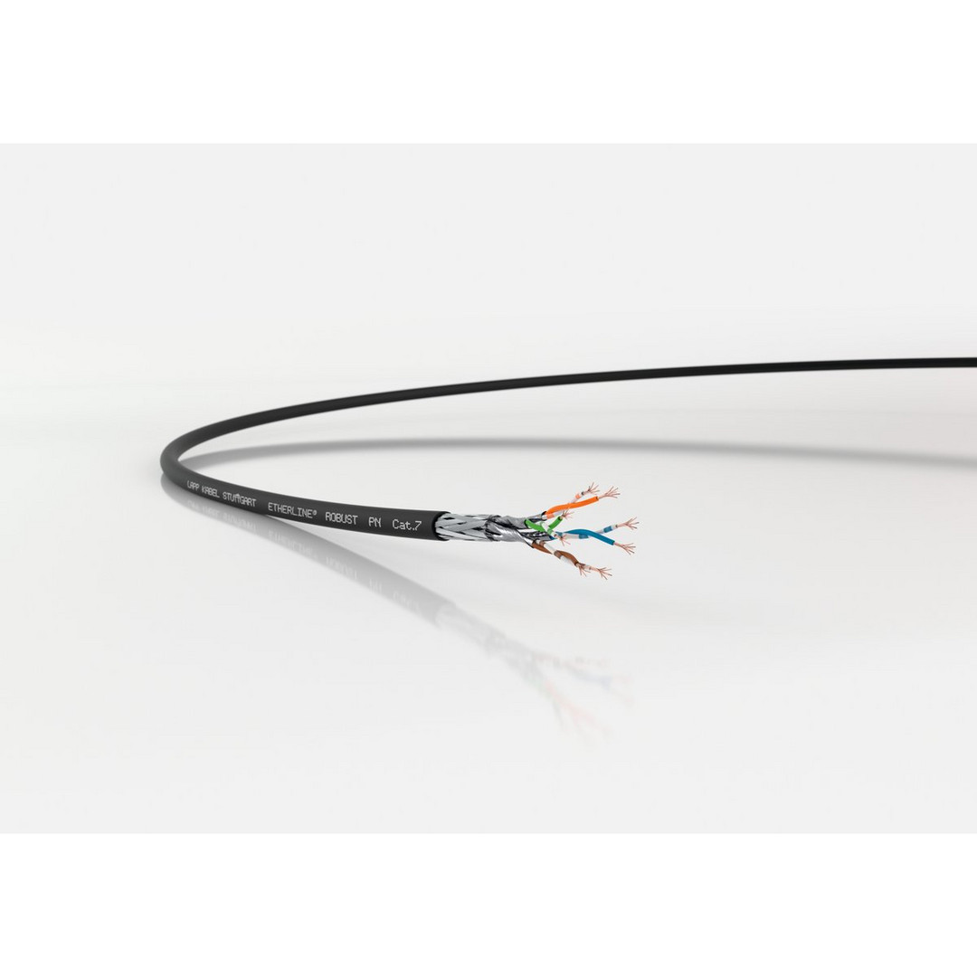 Ethernet-Leitung ETHERLINE® ROBUST PN Cat.7; Ethernet-Leitung; flexibel; ETHERNET/IP, EtherCAT; Cat.7; S/FTP; TPE; Halogenfrei; schwarz; Anwendungsgebiete: Auch für EtherCAT- und EtherNet/IP-Anwendungen geeignet;Für den Außenbereich geeignet;Variante „FLEX“ mit reduziertem Leiterquerschnitt ist für Anwendungen mit limitierten Platzverhältnissen geeignet;Varianten „PN“ sind für den flexiblen Einsatz im PROFINET-Netzwerk (Typ B) geeignet;Universell einsetzbar an Maschinenschnittstellen für viele Anwendungen zur Daten- und Signalübertragung;Zur strukturierten Gebäudeverkabelung gemäß EN 50173 und ISO/IEC 11801;Typische Verwendungsbereiche sind Waschanlagen, Kläranlagen, Kompostieranlagen und Anwendungen in der Lebensmittelindustrie;Für Anwendungen mit UV-C-Strahlung geeignet (nach LAPP-interner Prüfmethode); Nutzen: Geringe Rauchdichte im Brandfall (nach DIN EN IEC 61034-2);Besondere Eignung in Verbindung mit wasserlöslichen Reinigungs- und Kühlmitteln;Erhöhte Beständigkeit gegenüber elektromagnetischen Störungen dank Verseilung als Sternvierer sowie doppelter Schirmung aus aluminiumkaschierter Folie und Kupferabschirmgeflecht mit hohem Bedeckungsgrad (SF/UTP);Heißwasser- und dampfbeständig bei häufiger Dampfstrahlreinigung;Geprüfte Beständigkeit gegenüber ECOLAB®-Desinfektions- und Reinigungsmitteln;Zur Übertragung analoger und digitaler Signale im Frequenzbereich bis 100 MHz (Cat5e) bzw bis 600 MHz (Cat7);Exzellente Beständigkeit gegen eine Vielzahl chemischer Stoffe (zB Ammoniakverbindungen, Biogase) sowie pflanzlicher, tierischer oder synthetischer Fette und Öle (zB Bioöle und esterbasierte Hydrauliköle);Halogenfreie Aderisolier- und Mantelmischung zur Einhaltung besonderer Brandschutzanforderungen