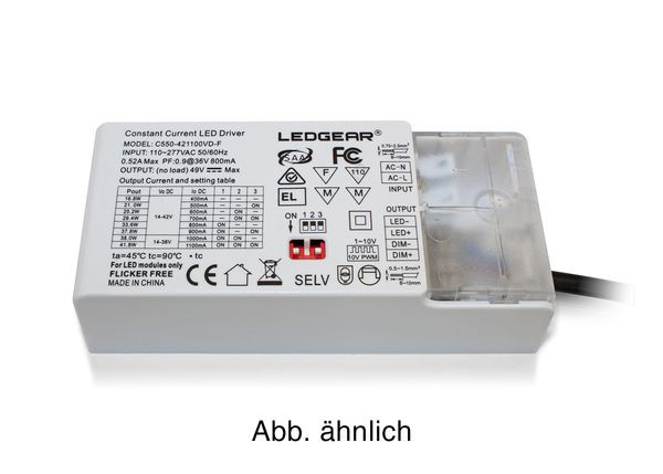 | Kurzbeschreibung | Treiber für LAS Panels - Wattage via DIP - Dim. via DALI, 0-10V, Push - 220-240V AC - 650-1100mA - 14-42V DC - inkl. AC u. DC Anschluß - EL-Konform |