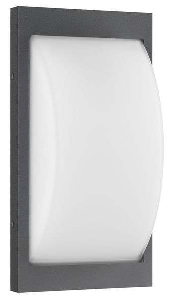 Leuchtenarmatur aus Aluminium-Druckguss, pulverbeschichtete Blende aus hochwertigem Edelstahl, Diffusor aus Opalglas. Farbe Graphit, Material Edelstahl, Opalglas, Lichtquelle: 1 x E27, 75 Watt, 220-240 V, 50-60 Hz, IP44, Schutzklasse I, Maß: 325x170x90