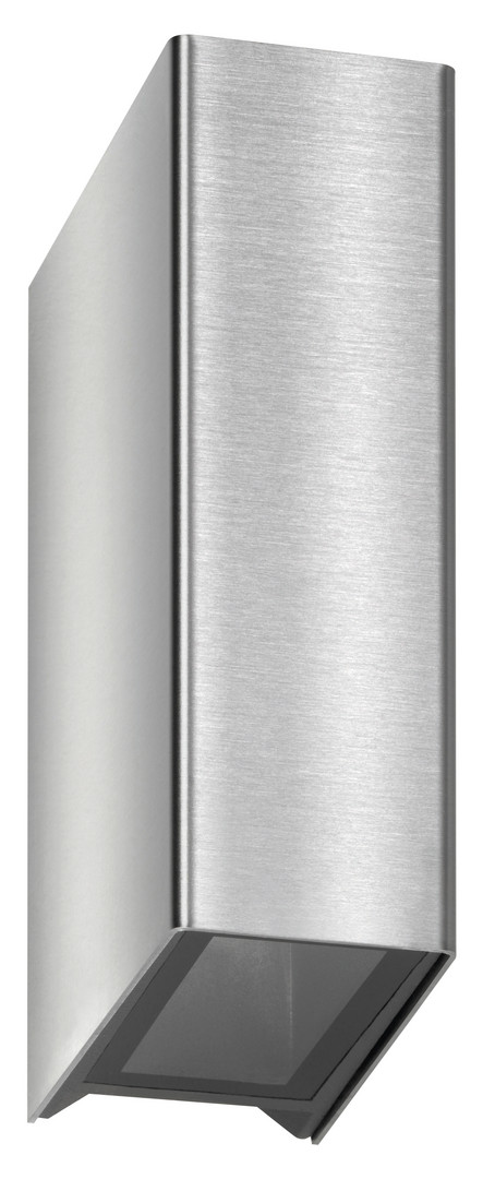 Up and Down LED-Wandleuchte aus Aluminium-Druckguss, Blende Edelstahl, Diffusor aus Floatglas, 2x LED 4W, ca. 3000 K, 710 lm, Schaltzyklen 150.000+, Abstrahlwinkel 2x 65°, IP54, BxHxT 43x125x90 mm