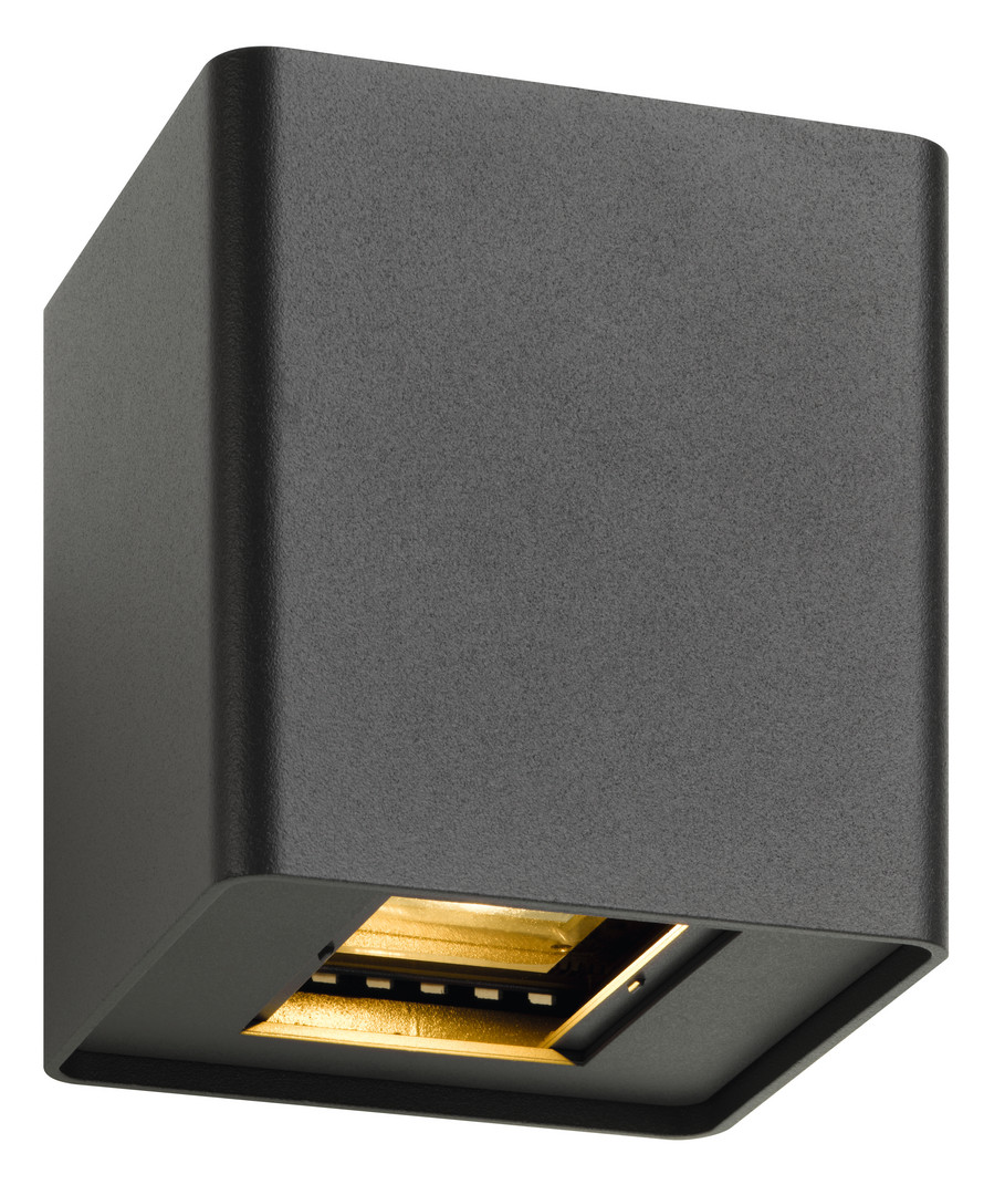 Pulverbeschichtete Up and Down Wandleuchte aus Aluminium-Druckguss, graphit, Diffusor aus Floatglas, 2x LED 5 W, ca. 3000 K, 1460 lm, Schaltzyklen 150.000+, Abstrahlwinkel oben und unten einstellbar von 0° bis 110°, IP54, BxHxT 100x105x119 mm