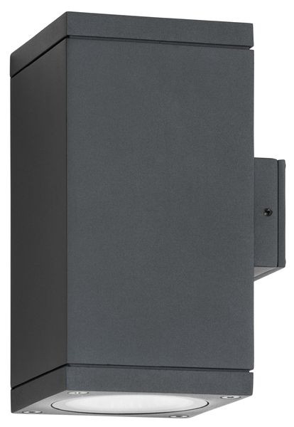 Pulverbeschichtete Leuchte aus Aluminium-Druckguss, Diffusor aus Floatglas. Mit Feuchtigkeitsausgleichsventil. Farbe Graphit, Material Aluminium-Druckguss, Flachglas, Lichtquelle: 2 x GU10, 2 x 7 Watt, 220-240 V, 50-60 Hz, IP65, Schutzklasse I, Maß: 156x80x95