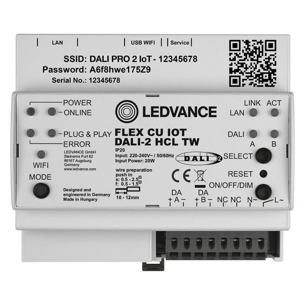 Steuergerät für bis zu 128 Lichtprodukten und bis zu 126 Sensoren/Tasterkoppler. Produkteigenschaften: DALI-2 zertifiziertes Steuergerät für bis zu 128 Lichtprodukten und bis zu 126 Sensoren/Tasterkoppler. IoT-fähig mit integriertem Gateway für Datenfernzugriff. Kompatibel mit LEDVANCE DALI IoT WEB UI und DALI IoT CONFIG Software. Integration in Gebäudemanagementsysteme über optionale KNX-Schnittstelle. Inbetriebnahme über LAN/WLAN. Kleiner Formfaktor: nur 6 TE (DIN Norm). Leitungslänge der DALI-Steuerleitung: bis zu 300 m. Produktvorteile: DALI-2 zertifiziertes Steuergerät für verbesserte Multi-Vendor-Interoperabilität. BIOLUX Human Centric Lighting für hochgenaues künstliches Tageslicht in Räumen. Fernzugriff zum Anpassen der Einstellungen in der Installation von jedem beliebigen Ort. LAN Interconnect für die Verbindung von bis zu 8 Controller in einem Netzwerk. Rest-API zur Anbindung einer 3rd Party Cloud mit dem FLEX CU IOT DALI-2 HCL TW Controller. Kompatibel mit dem optionalen VIVARES Cloud Service. Anwendungsgebiete: Flächenbeleuchtung bis 1000 qm mit einem Steuergerät. Raum- und Stockwerkssteuerung. Anbindung von Licht- und Präsenzsensorik für automatisierte Lichtsteuerung. RGB- und Tunable-White-Anwendungen. Technische Ausstattung: Kostenlose App für iOS und Android verfügbar im App Store.