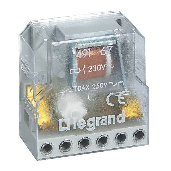 Legrand Fernschalter, zum Einbau in Unterputz-Dose, 2-polig, 10 A/ 250 VAC, Steuerspannung AC 230 V, 2 Schließer, Glimmlampenstrom max. 50 mA, Schutzklasse IP 20, Abmessung: 49 x 50 x 36 mm (Höhe x Breite x Tiefe).