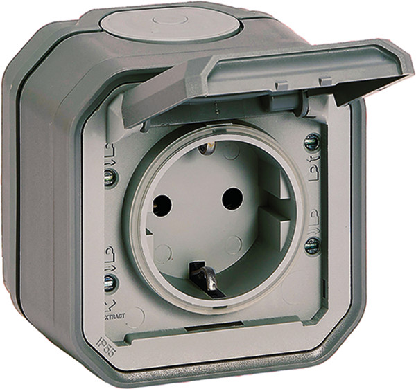 Plexo New Feuchtraum-Aufputz Schutzkontakt-Steckdose Steckklemmen (SL) mit erhöhtem Berührungsschutz, IP 44, IK 08, in der Farbe: Grau