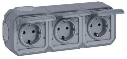 Plexo New Feuchtraum-Aufputz 3-fach vorverdrahtete Schutzkontakt-Steckdose horizontal Steckklemmen (SL) mit erhöhtem Berührungsschutz, IP 44, IK 08, in der Farbe: Grau