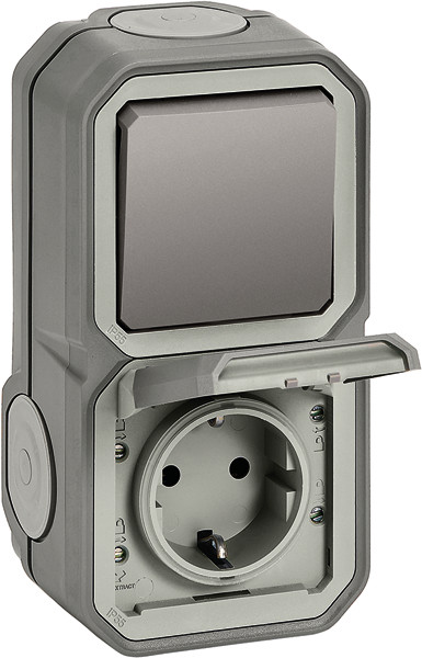 Plexo New Feuchtraum-Aufputz Schutzkontakt-Steckdose + Wechselschalter horizontal und vertikal, Steckklemmen mit erhöhtem Berührungsschutz, IP44, IK 08, in der Farbe: Grau