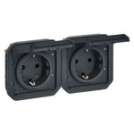 Plexo New Einsatz 2-fach vorverdrahtete Schutzkontakt-Steckdose horizontal Steckklemmen (SL) mit erhöhtem Berührungsschutz, IP 44, IK 08, in der Farbe: Anthrazit. Einsätze müssen in einem Tragring (Unterputzrahmen ) oder einem Aufputzgehäuse installiert werden.