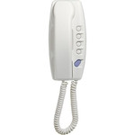 Hausstation SPRINT mit Mithörsperre, für Standard-Gegensprechanlagen, gewendelte Hörerschnur steckbar, für elektronischen Rufton mit Ruflautstärkeschalter, Elektretmikrofon, 1 Türöffnertaste, Platz für 4 Zusatztasten oder Rufabschaltung mit LED-Anzeige. Montage mit beigelegten Schrauben und Dübeln oder auf Schalterdose oder mit Tischkonsole als Tischgerät. Farbe: Weiß