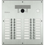 Bestehend aus verzinktem Unterputzkasten, Tragrahmen und vandalensicherer Frontblende aus Edelstahl, LED beleuchtete Namensschilder, Lautsprecher mit integrierter Farb-Kamera, Anschluss für 2-Draht-BUS und Türöffner, Schutzklasse: IP 54, IK 08 32 Ruftasten, Maße (B×H): 340×370 mm, UP-Kasten Maße (B×H×T): 308×329×50 mm