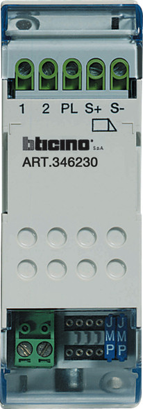 Türöffner-Relais für 2-Draht-Anlagen in Verbindung mit Einbaulautsprecher Art.Nr. 346991 oder für zusätzliche Türöffnersteuerungen, 2 Anschlussklemmen für Bus-Leitung und Türöffner, 2 TE DIN.