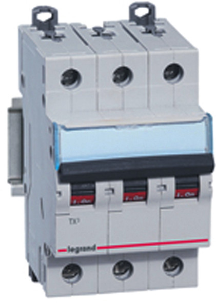 Legrand Leitungsschutzschalter TX3 nach EN 60898-1, VDE 0641-11, EN 60947-2, 3-polig, C-Charakteristik, Bemessungsstrom In 10 A, Bemessungsschaltvermögen Icn 6 kA nach EN 60898-1, Bemessungsspannung Un 400 VAC, Bemessungsfrequenz 50/60 Hz, Energiebegrenzungsklasse 3, Befestigung auf Hutprofilschiene EN 60715 durch eine rastende Schnellbefestigung, klare Information vorne auf jedem Gerät, eindeutige Schaltstellungsanzeige rot/grün am Schalthebel, mit Beschriftungsfenster, mit Untersteckschutz zum sicheren Einführen des Leiters in Fahrstuhlklemme, Anbau von Hilfsgeräten möglich. Leitungsschutzschalter mit C-Charakteristik sind für den Leitungsschutz bei Geräten mit hohen Einschaltströmen (z.B. Motoren und Transformatoren) vorgesehen.