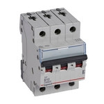 Legrand Leitungsschutzschalter TX3 nach EN 60898-1, VDE 0641-11, EN 60947-2, 3-polig, B-Charakteristik, Bemessungsstrom In 10 A, Bemessungsschaltvermögen Icn 10 kA nach EN 60898-1, Bemessungsspannung Un 400 VAC, Bemessungsfrequenz 50/60 Hz, Energiebegrenzungsklasse 3, Befestigung auf Hutprofilschiene EN 60715 durch eine rastende Schnellbefestigung, klare Information vorne auf jedem Gerät, eindeutige Schaltstellungsanzeige rot/grün am Schalthebel, mit Beschriftungsfenster, mit Untersteckschutz zum sicheren Einführen des Leiters in Fahrstuhlklemme, Anbau von Hilfsgeräten möglich. Leitungsschutzschalter mit B-Charakteristik sind vornehmlich für den Leitungsschutz in Licht- und Steckdosen-Stromkreisen bestimmt.