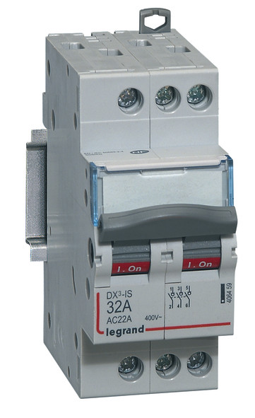 Legrand Lasttrennschalter DX3, 3-polig, 63A 400 VAC, nach EN 60947-3, EN 60669-2-4. Gebrauchskategorie AC-22A. Befestigung auf Hutprofilschiene EN 60715 durch rastende Schnellbefestigungen, klare Information vorne auf jedem Gerät, eindeutige Schaltstellungsanzeige rot/grün am Schalthebel (verriegelbar), mit Beschriftungsfenster, einpolig verschienbar mit Legrand Stiftkammschienen, Anbau von Hilfsgeräten möglich.