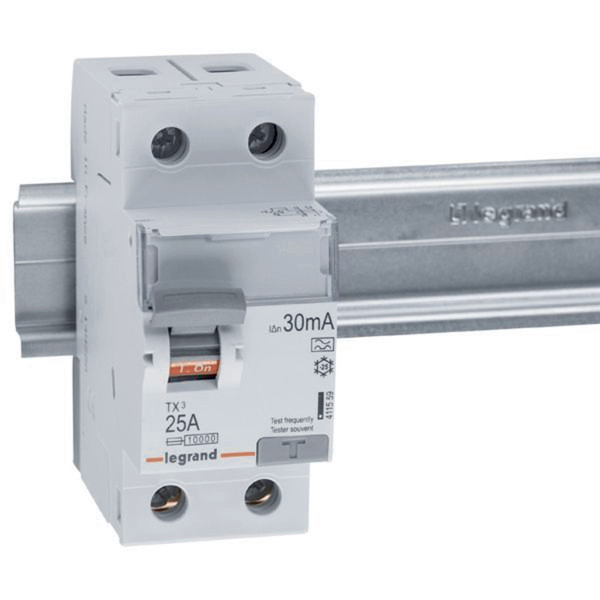Legrand Fehlerstromschutzschalter TX3, Typ A, für Wechsel- und pulsierende Gleichfehlerströme nach VDE 0664-10, EN 61008-1, unverzögert, 2-polig, Bemessungsstrom In 25 A, Bemessungsfehlerstrom Idn 30 mA, Bemessungsspannung Un 230 VAC, Bemessungsfrequenz 50 Hz, Stoßstromfest bis 250 A, Bemessungskurzschlussstrom 10 kA bei geeigneter Vorsicherung, Befestigung auf Hutprofilschiene EN 60715 durch rastende Schnellbefestigungen, klare Information vorne auf jedem Gerät, eindeutige Schaltstellungsanzeige rot/grün am Schalthebel, mit Beschriftungsfenster, mit Untersteckschutz zum sicheren Einführen des Leiters in Fahrstuhlklemme, Anbau von Hilfsgeräten möglich.