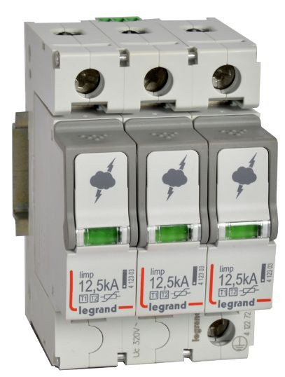 Legrand Kombiableiter Typ 1+2/Class I+II nach IEC/EN 61643-11, 3+0 Schaltung, für TN-C Systeme, Nennspannung 230/400 VAC, Blitzstoßstrom Iimp(10/350) 12,5 kA/Pol. Höchste Dauerspannung (Uc) 320 VAC. Zum Schutz vor Überspannungen nachgeordneter Verbraucher durch direkte/ indirekte Blitzeinschläge oder Schalthandlungen. Mit Plug-in Schutzmodul und Statusanzeige: Grün(SPD betriebsbereit) Orange (Plug-in Schutzmodul austauschen), mit Fernmeldekontakt zur Signalisierung des Schutzstatus.