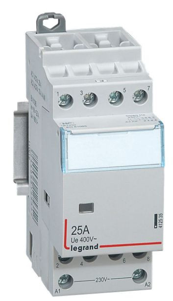 Legrand Installationsschütz CX3, Spulenspannung AC 230 V, 4-polig, Ausführung: 4 Schließer, Bemessungsbetriebsstrom Ie 25 A/ 400 VAC, ohne Handschalter. Nach EN 61095, Gebrauchskategorie AC-1/AC-7a und AC-3/AC-7b, Installationsschütze zum Schalten von Lasten wie z.B. Lampengruppen, Motoren und Heizungen, mit Beschriftungsfenster, mit Schaltzustandsanzeige, Befestigung auf Hutprofilschiene EN 60715 durch rastende Schnellbefestigung, Anbau von Hilfsschaltern möglich.