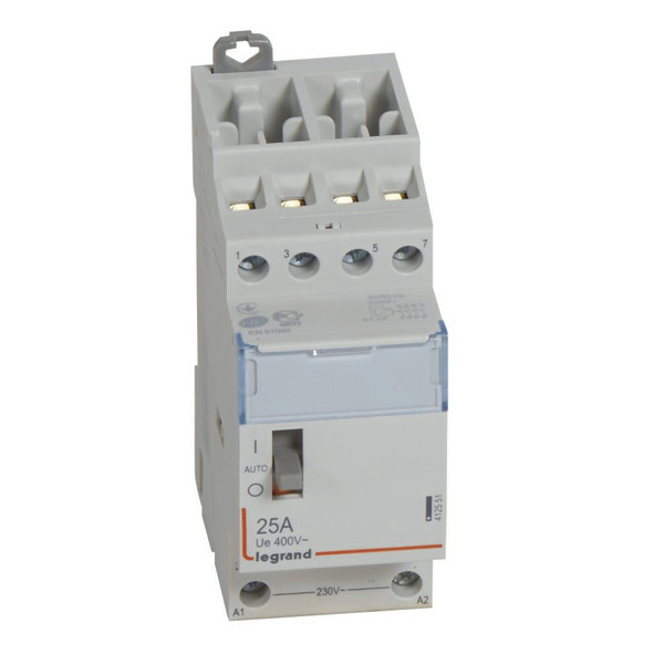Legrand Installationsschütz CX3, Spulenspannung AC 230 V, 4-polig, Ausführung: 4 Schließer, Bemessungsbetriebsstrom Ie 25 A/ 400 VAC, mit Handschalter. Nach EN 61095, Gebrauchskategorie AC-1/AC-7a und AC-3/AC-7b, Installationsschütze zum Schalten von Lasten wie z.B. Lampengruppen, Motoren und Heizungen, mit Beschriftungsfenster, mit Schaltzustandsanzeige, Befestigung auf Hutprofilschiene EN 60715 durch rastende Schnellbefestigung, Anbau von Hilfsschaltern möglich.