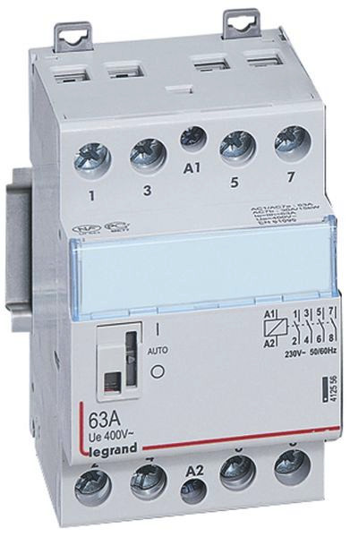 Legrand Installationsschütz CX3, Spulenspannung AC 230 V, 4-polig, Ausführung: 4 Schließer, Bemessungsbetriebsstrom Ie 63 A/ 400 VAC, mit Handschalter. Nach EN 61095, Gebrauchskategorie AC-1/AC-7a und AC-3/AC-7b, Installationsschütze zum Schalten von Lasten wie z.B. Lampengruppen, Motoren und Heizungen, mit Beschriftungsfenster, mit Schaltzustandsanzeige, Befestigung auf Hutprofilschiene EN 60715 durch rastende Schnellbefestigung, Anbau von Hilfsschaltern möglich.