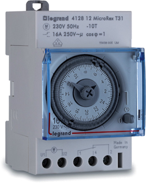 Legrand MicroRex T31, analoge Tageszeitschaltuhr mit Synchronmotor (netzsynchrone Ganggenauigkeit) für Verteilereinbau, 1 Kanal, Betriebsspannung 230 V 50 Hz, mit Handschalter: EIN-Automatik-AUS, mit unverlierbaren Schaltsegmenten, Zeiger vorwärts und rückwärts drehbar, dadurch sehr leichte Einstellung von z.B. Sommer- und Winterzeit, Deckel plombierbar, kürzeste Schaltzeit: 30 Min.. Schaltausgang: 1 Wechsler.