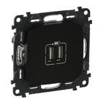 Valena Allure USB-Ladesteckdosen, 2-fach z.B. zum Laden von Smartphones, MP3-/MP4-Player und Tablets. Ausgangsspannung 5 V mit maximalem Ladestrom von 2400 mA bei einem Gerät oder 1200mA pro Ausgang bei gleichzeitigem Laden von 2 Geräten; Konform nach IEC 62684-2011-01. Schraubklemmenanschluss: 230 V~, geliefert inkl. Abdeckung, Ladekabel nicht im Lieferumfang enthalten. Farbe: Schwarz
