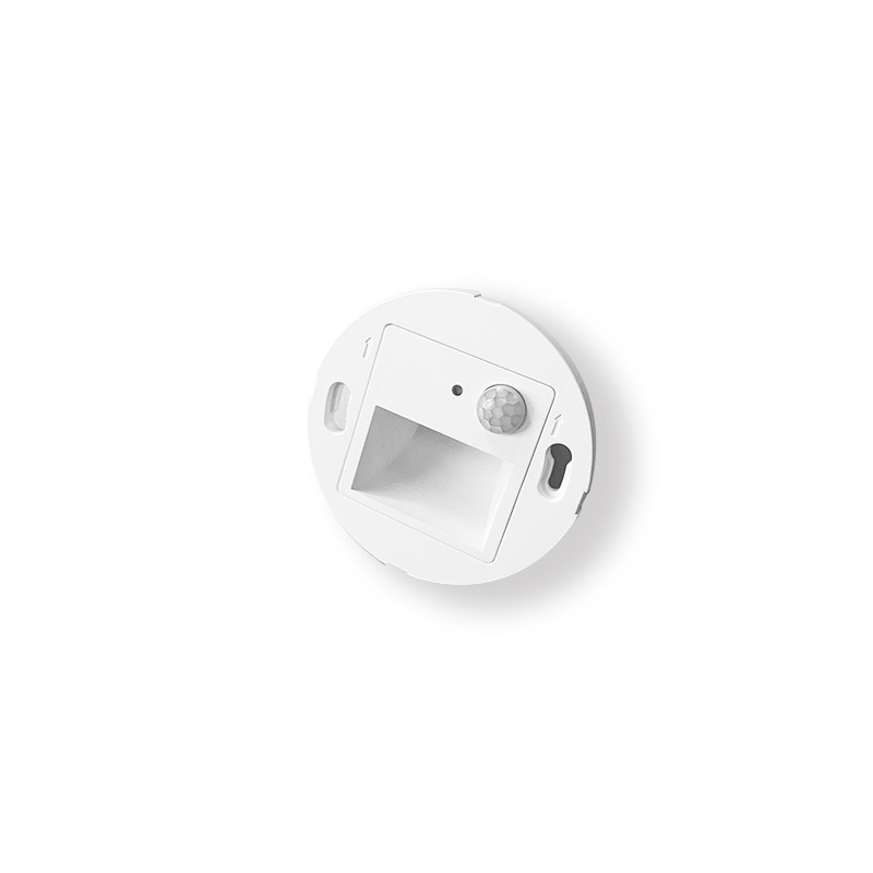 LED-Wandeinbauleuchte, mit eingebautem Bewegungsmelder und Tageslichtsensor, Lichtfarbe in 3000K/4000K/5700K mit DIP-Schalter einstellbar, vier austauschbare Rahmen mit verschiedenen Bauformen und Beleuchtungseffekten, einfach für Installation, Einbautiefe 41mm, flackerfrei, Anwendung für Treppenhaus, Flur, Eingangsbereich, Schlafzimmer / als Nachtlicht, Leistung: 2W, Gehäusematerial: PC, Gehäusefarbe: Weiß RAL9016, max. 80lm(ohne Rahmen), Ausstrahlungswinkel 80°(bei quadratischem Loch)/90°(bei gestreiftem Loch), CRI>80, nicht dimmbar, Lichteffekt austauschbar, Schutzart: IP44, Steckklemme: 4 polig LLNN, Anschlussleistung: AC230V, 50/60Hz, Abmessung: 80x80x41, Montageart: Wandmontage
