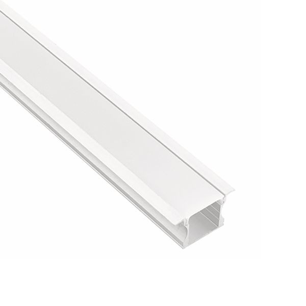 Aluprofil für LED-Strip, Einbau, 1500mm, 24x14mm, für bis zu 11mm breite Strip, inklusive diffuser Abdeckung, mit zwei Endkappen (eine davon mit Loch für Kabeleinführung), mit drei Befestigungsklemmen aus Edelstahl