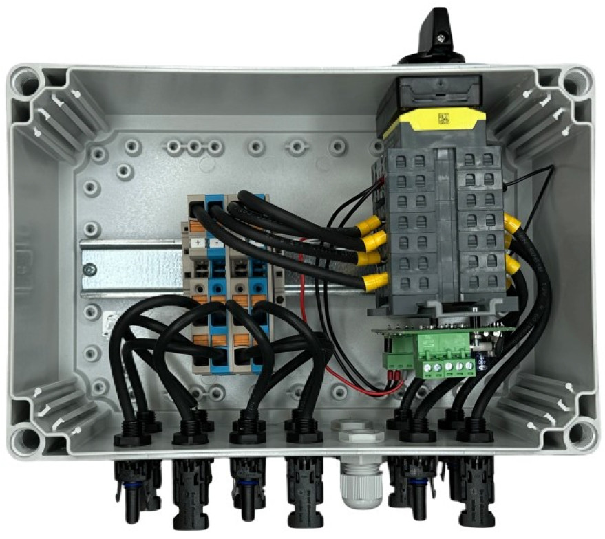 für 2 Maximum Power Point Tracker (MPPT) mit 2 Eingängen und 1 Ausgang pro MPPT.Anschlussmöglichkeiten für 2 PE-Kabel zum Durchschleifen.Die Produktreihe „GAK-FWS“ von Leutron umfasst einen Generatoranschlusskasten (GAK)mit einem motorbetriebenen DC-Schalter, der die Funktion eines Feuerwehrschalters (FWS) übernimmt.Damit lassen sich im privaten und gewerblichen Bereich PV-Strangleitungen zum Wechselrichter automatisch abschalten.Der FWS wird mit einer AC-Spannung von 230 V über den Switch Controller versorgt. Sollten durch einen Brand oder Hochwasserdie PV-Strangleitungen getrennt werden, muss die Spannungsversorgung des FWS unterbrochen werden.Dies führt dazu, dass der FWS automatisch in die Ausschaltposition geht.Über den Feedback Connector (FB) am Switch Controller lässt sich der Status des FWS abfragen: Der Kontakt istgeschlossen, wenn die AC-Versorgung vorhanden ist, und öffnet sich, wenn die AC-Versorgung nicht vorhanden ist.Eingang / Ausgang über MC4 SteckverbinderAbmessungen B x L x T: 200 x x300 x 132 mm