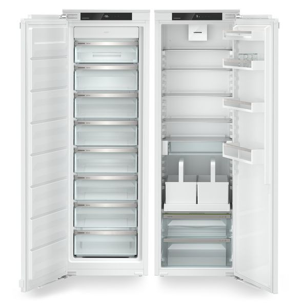 Side-by-Side Set (auch als Einzelgeräte nutzbar), integrierbar, Rauminhalt Kühlen: 309 l, Super-Kühlen, Umluftkühlung, Flaschenkorb mit Auszug, Frische-Behälter: 1, Glasablageflächen: 5, Obst-/Gemüsebehälter: 1, VarioSafe (Kleinere Lebensmittel, Packungen, Tuben und Gläser sind in diesem Schubfach optimal aufbewahrt), LED-Beleuchtung, Rauminhalt Gefrieren: 213 l, Schubladen: 8, VarioSpace (einzelne Gefrierschubfächer herausnehmbar, für extra hohen Stauraum), NoFrost, Super-Gefrieren, Display, Touch-Funktion, digitale Temperaturanzeige, Kühl-/Gefrierteil getrennt regelbar, SmartDevice fähig (Steuerung über Internetverbindung mit optional erhältlicher SmartDeviceBox möglich), per App unterstützter Datentransfer, per App steuerbar, Energieeffizienzklasse E, Made in Germany