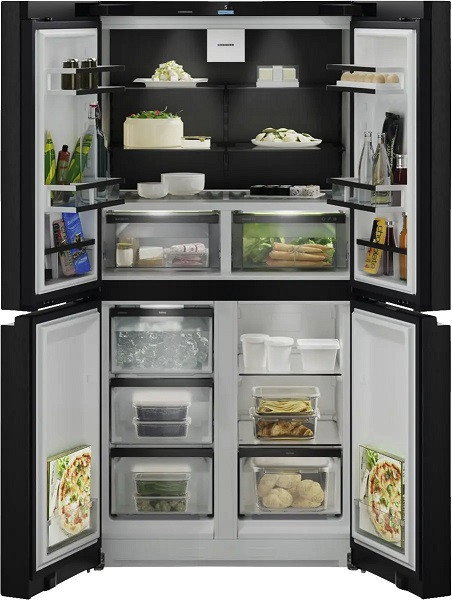 Kühlteil: PowerCooling mit FreshAir-Aktivkohlefilter, SuperCool, Rückwand BlackSteel-Look, LED-Deckenbleuchtung, 5 GlassLine-Abstellflächen, davon 4 höhenverstellbar, integrierte Flaschenablage,