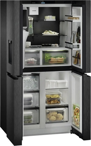 Kühlteil: PowerCooling mit FreshAir-Aktivkohlefilter, SuperCool, Rückwand BlackSteel-Look, LED-Deckenbeleuchtung, 5 GlassLine-Abstellflächen, davon 4 höhenverstellbar, integrierte Flaschenablage, Water & Ice centre außen in der Tür für frisches, gekühltes Wasser, Eiswürfel und Crushed Ice,