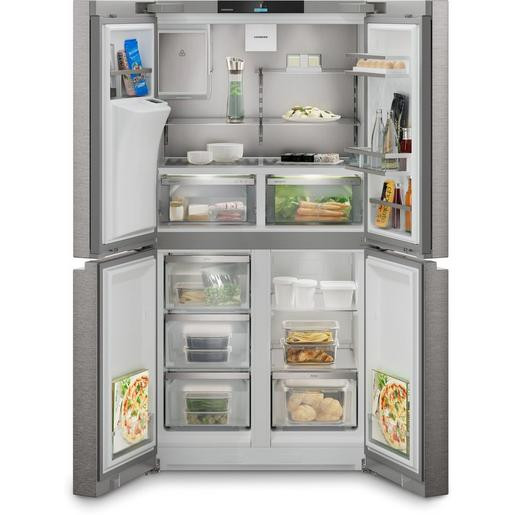 Kühlteil: PowerCooling mit FreshAir-Aktivkohlefilter, SuperCool, Rückwand SmartSteel-Look, LED-Deckenbeleuchtung, 5 GlassLine-Abstellflächen, davon 4 höhenverstellbar, integrierte Flaschenablage, Water & Ice centre außen in der Tür für frisches, gekühltes Wasser, Eiswürfel und Crushed Ice,