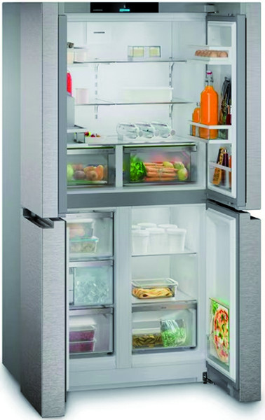 Kühlteil: PowerCooling mit FreshAir-Aktivkohlefilter, SuperCool, LED-Deckenbleuchtung, 5 GlassLine-Abstellflächen, davon 4 höhenverstellbar, 3er Flaschenablage, 2 EasyFresh-Safes auf Teleskopauszügen,