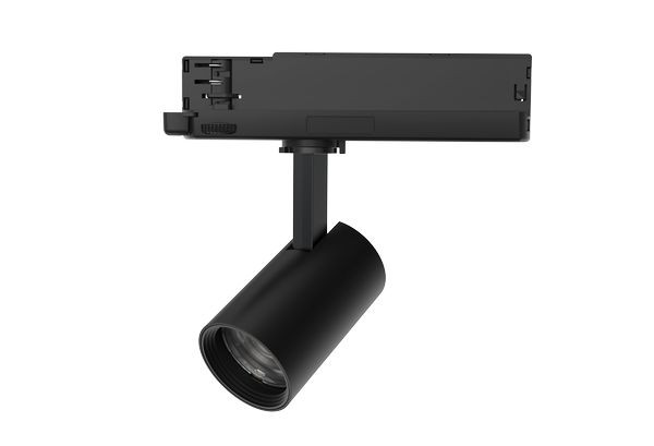 3-in-1 LED-Schienenstrahler ANGOLO S (schwarz) mit 11 W/900 lm Bemessungslichtstrom und dreifach verstellbarem Abstrahlwinkel (15°/24°/36°) zur Anpassung des Ausleuchtungsbereichs und der Lichtstärke. Farbtemperatur 4000 K (neutralweiß), sehr gute Farbwiedergabe CRI 90, akzentuierte und klar abgegrenzte Lichtkegel. Integrierte LED-Lichtquelle und integrierter Treiber. Einstellung der drei Abstrahlwinkel durch Drucktaster auf der Rückseite des Leuchtenkopfes, der 350° drehbar und 90° schwenkbar ist. Leuchtengehäuse aus Alu-Druckguss. 3-Phasendapater für professionelle Schienensysteme.